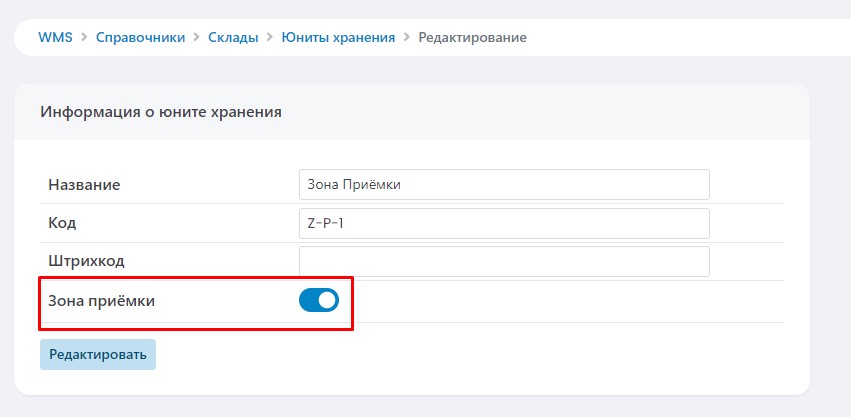 Для этого перейдите в редактирование Юнита хранения и установить флажок «Зона приёмки» в активное положение.