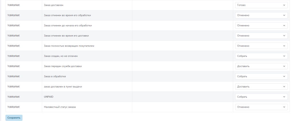 Для настройки сопоставления внутренних статусов Raxs и получаемых с маркетплейса существует возможность распределить свои значения по группам.