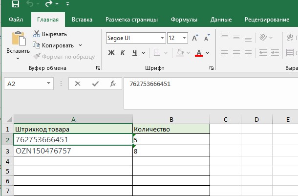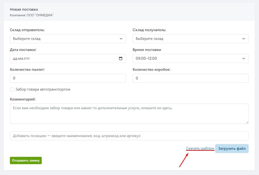 Внимание: Штрихкоды которые вы будете загружать через фаил, должны уже быть добавлены в систему.При создании заявки скачате Excel фаил по ссылке «»Скачайте шаблон».Откройте скаченный фаил с шаблоном.Заполните столбец с штрихкодом товара и его количеством.Сохраните фаил.Нажмите на странице создания заявки на кнопку «Загрузить фаил».Выберите в открывшемся окне, ранее сохранённый фаил.После чего товары будут добавлены к заявке. Было ли это полезно? ДаНет 0 / 0